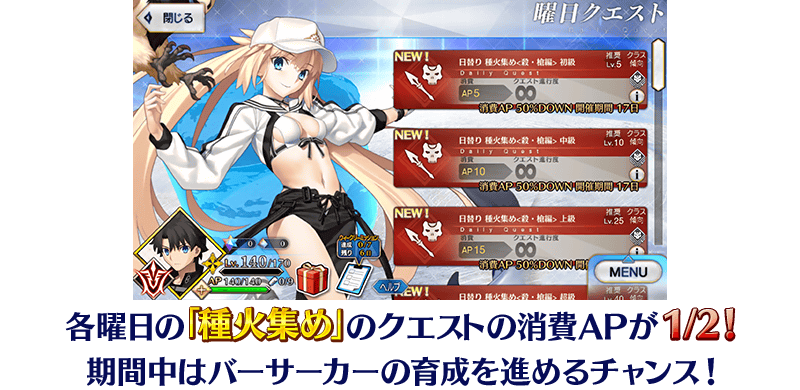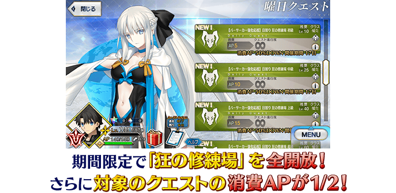 限定 バーサーカークラスの「修練場」を開放&消費AP1/2!
