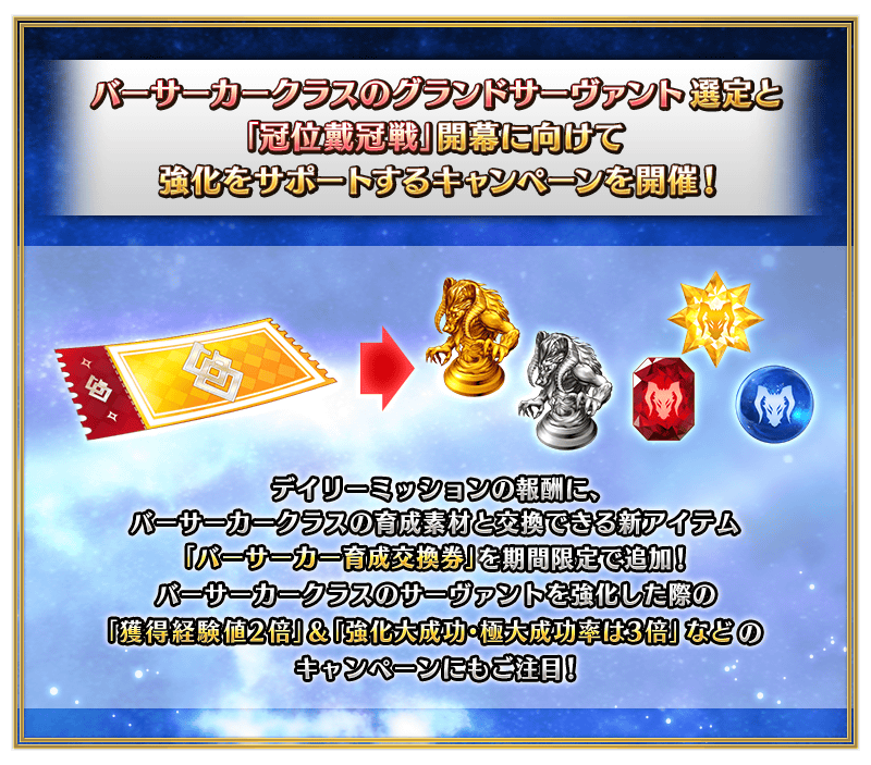 新たな戦いに備えるために、バーサーカークラスのサーヴァント強化をサポートするキャンペーンを開催いたします!