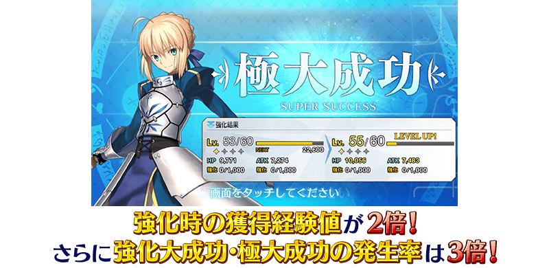 ※現在開催されている他キャンペーンにて、「すべてのサーヴァントの強化をおこなった際の大成功・極大成功の発生率が2倍」が実施されておりますが、本キャンペーンの期間中は、「セイバークラスのサーヴァント強化時の大成功・極大成功の発生率は3倍」が優先的に適用されます(効果は重複いたしません)。 ※現在開催されている他キャンペーンにて、「一部のサーヴァントの強化をおこなった際の獲得経験値が2倍」を実施しておりますが、各キャンペーンで「獲得経験値が2倍」の対象となっている場合でも効果は重ならず、獲得経験値は2倍となります。 ※サーヴァントスキル強化、霊基再臨(サーヴァント進化)、絆レベル上限開放、コマンドコード刻印、コマンドカード強化、アペンドスキル強化、サーヴァント宝具強化、聖杯転臨、霊衣開放、クラススコアは対象外となりますのでご注意ください。