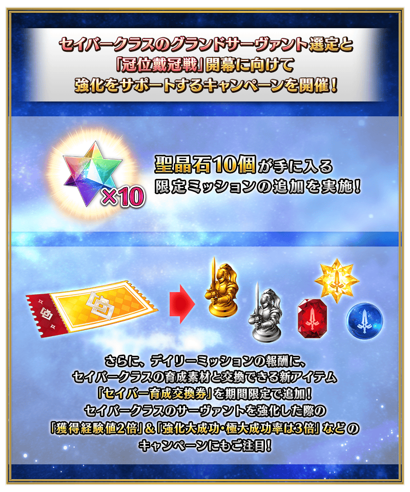 新たな戦いに備えるために、セイバークラスのサーヴァント強化をサポートするキャンペーンを開催いたします!