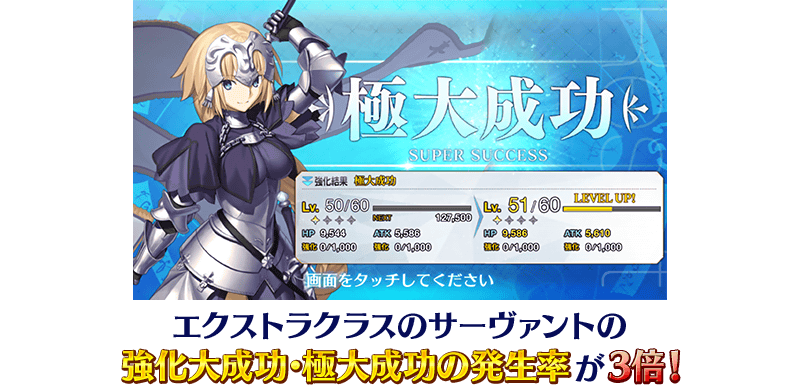 下記の期間中、エクストラクラスのサーヴァントの強化をおこなった際の大成功(経験値2倍ボーナス)・極大成功(経験値3倍ボーナス)の発生率が3倍になります!