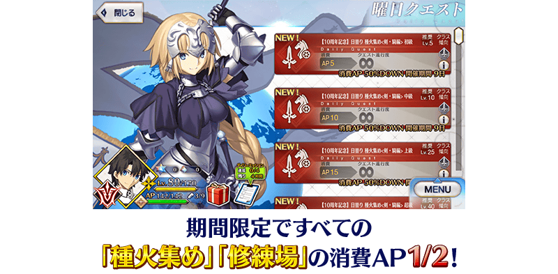 限定 すべての「種火集め」「修練場」の消費AP1/2!