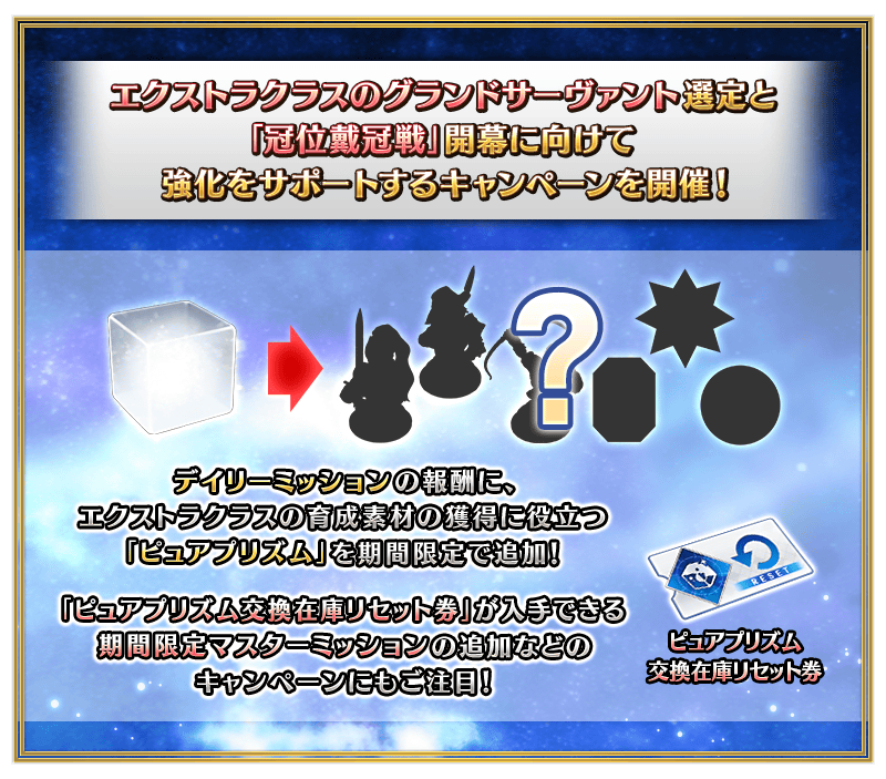 | いずれかのクラスのサーヴァントを1騎グランドクラスに選定せよ ※8月3日(日) 18:00より達成可能 |