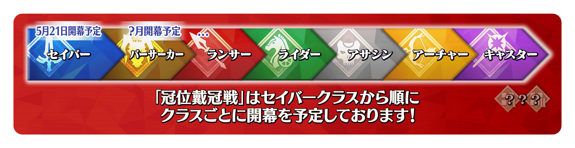 第1弾はセイバークラスの「冠位戴冠戦」となり、以降は順次クラスごとに「冠位戴冠戦」の開幕を予定しております。