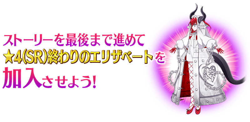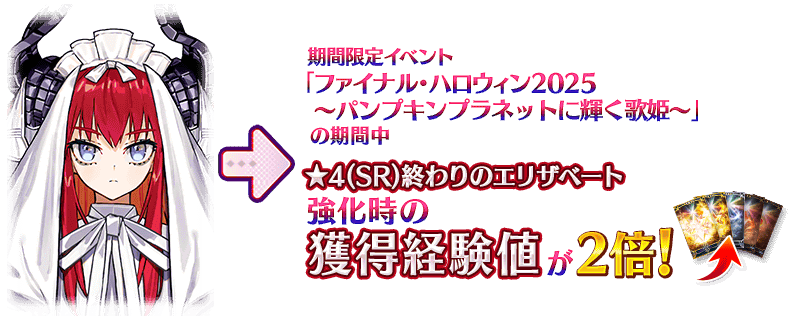 本イベントの期間中は、「★4(SR)終わりのエリザベート」を強化した際の獲得経験値が2倍になります。