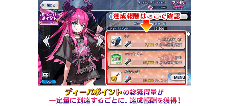 「ディーバポイント」の総獲得量が一定量に到達するごとに、達成報酬として各種サーヴァントの育成素材のほか伝承結晶などを獲得できます。