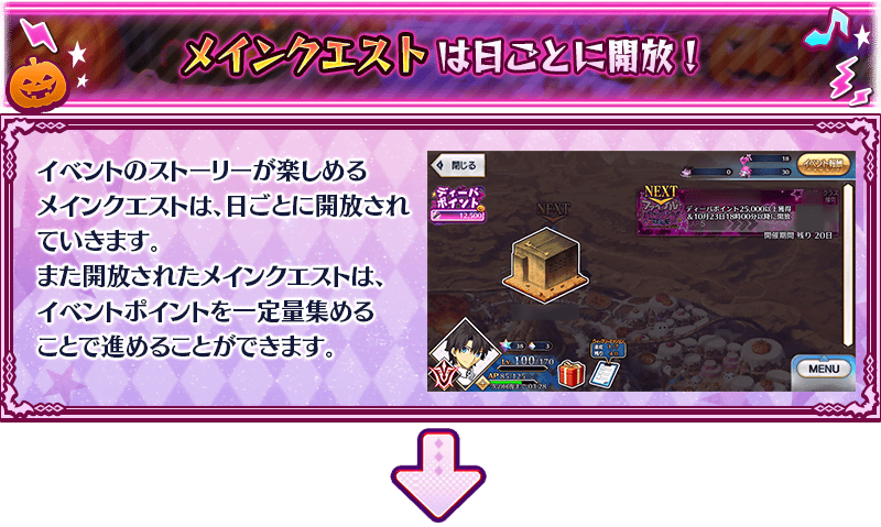 ※一部のクエストは後日開放されます。 ※「マテリアル(ギャラリー)」に本イベントのイベントCGやムービーが追加されるのは、2025年11月12日(水) 13:00からとなります。 ※本ページの画像はすべて開発中のものです。実際の画像とは異なる場合があります。 ※2019年1月1日(火) 0:00以降に新たに配信されるメインストーリー、期間限定イベント、一部クエスト、キャンペーンおよび召喚では、真名隠し対象サーヴァントの真名が表示されます。