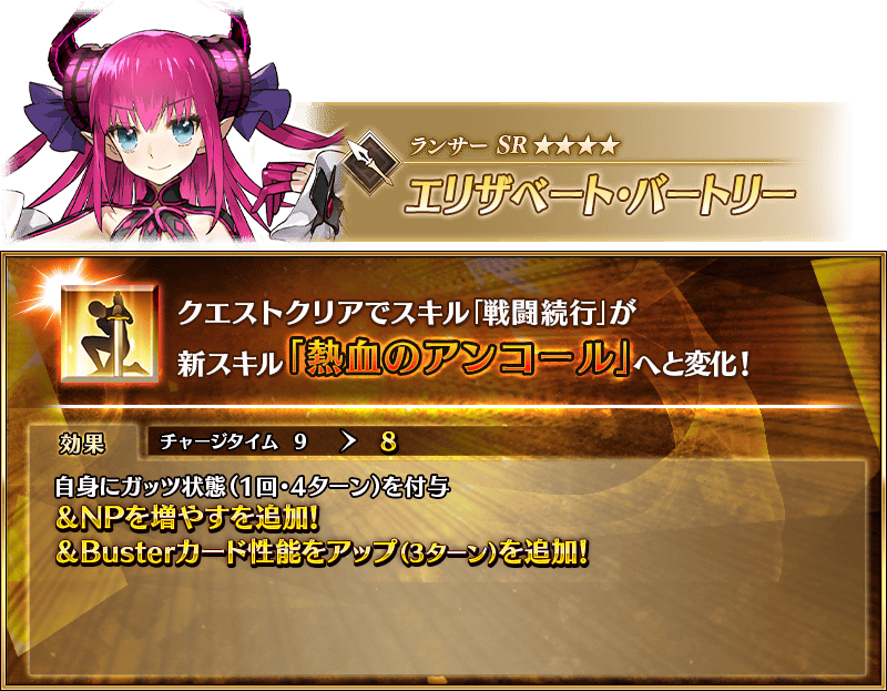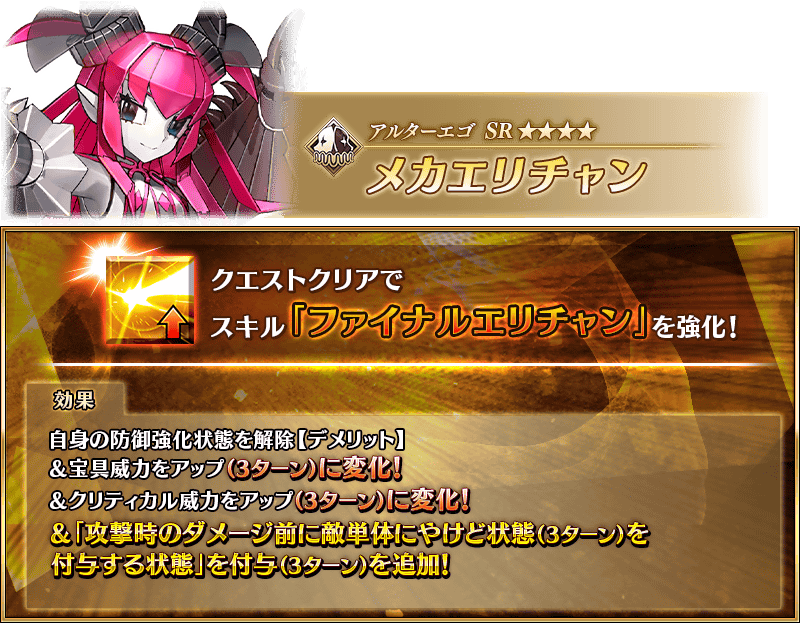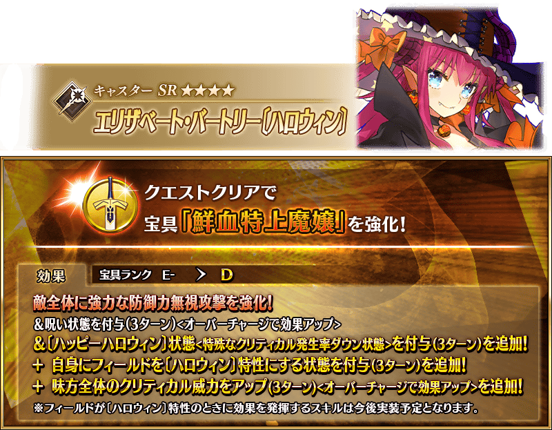 「★4(SR)エリザベート・バートリー」「★4(SR)エリザベート・バートリー〔ハロウィン〕」「★4(SR)メカエリチャン」「★4(SR)メカエリチャンⅡ号機」が強化される特別なクエスト「サーヴァント強化クエスト」が、カルデアゲートに恒常的に追加されます。
