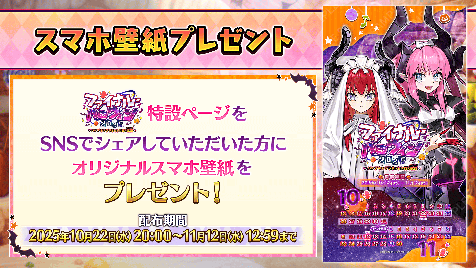 期間限定イベント「ファイナル・ハロウィン2025 ~パンプキンプラネットに輝く歌姫~」の特設ページにて、スマートフォン向け壁紙のプレゼントが実施中!