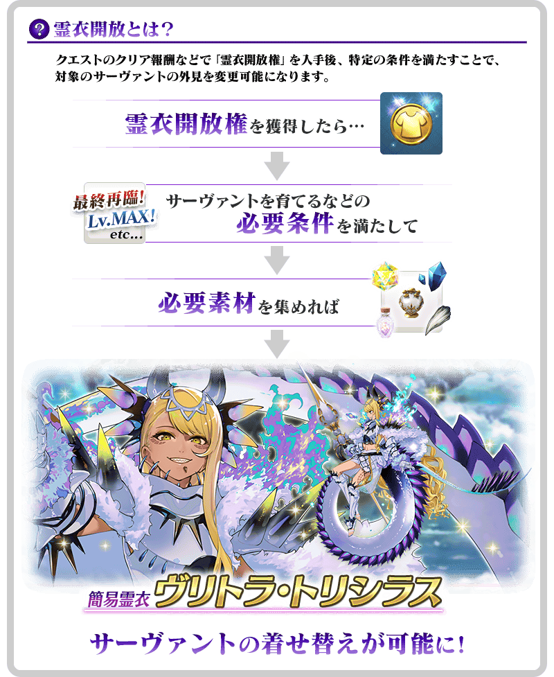※「★5(SSR)ヴリトラ」の簡易霊衣開放権は、期間限定イベント「インドラの大試練 ~巡るブロークン・スカイ~」のイベントアイテム交換期間のみ入手可能です。 ※「★5(SSR)ヴリトラ」を未所持の場合、霊衣開放権は入手できますが、霊衣開放はおこなえませんのでご注意ください。 ※「★5(SSR)ヴリトラ」の簡易霊衣「ヴリトラ・トリシラス」は外見のみ変化し、ボイスは変化しない「簡易霊衣」です。