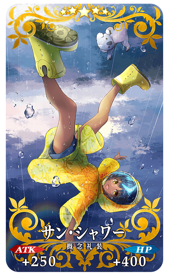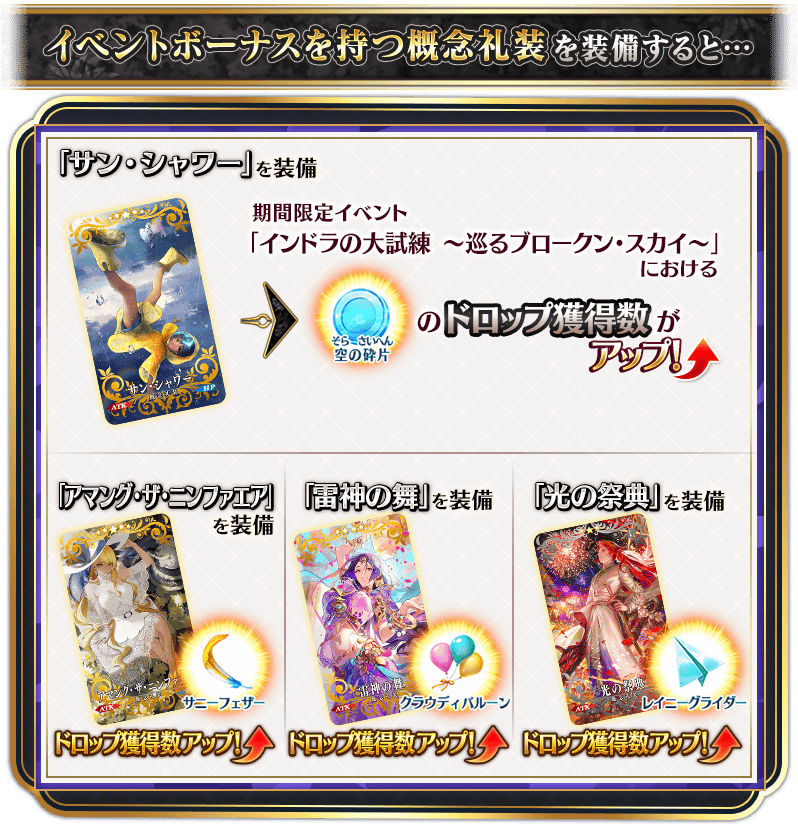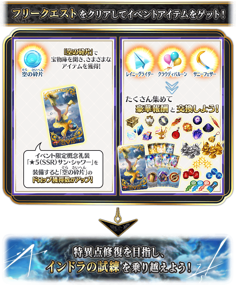 ※簡易霊衣「ヴリトラ・トリシラス」開放権は、メインクエストクリア後に交換可能になります。 ※伝承結晶、英霊結晶・流星のフォウくんALL★4(HP)、英霊結晶・日輪のフォウくんALL★4(ATK)については、後日開放される本イベントのメインクエストをクリアすることで交換可能になります。 ※イベントアイテム交換期間終了後「サニーフェザー」「クラウディバルーン」「レイニーグライダー」は消滅します。