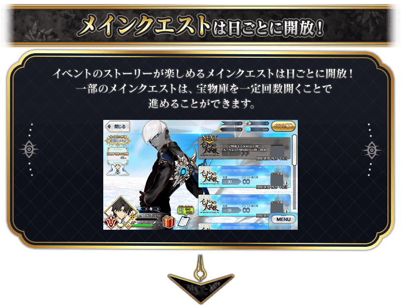 | クエストの種類 | 開催期間 | 開放に必要な 宝物庫を開く回数 |