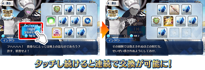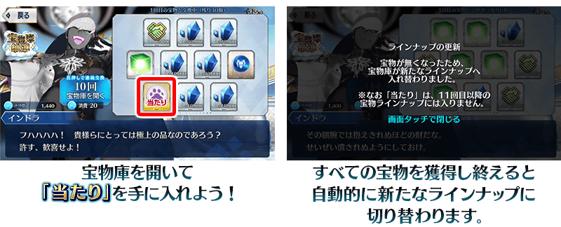 ※宝物庫抽選の1回目~10回目では、「当たり」「美味い酒(インドラチケット)」をすべて獲得することで「宝物庫を更新」が表示されます。 ※11回目以降は、「宝物庫を更新」は表示されず、すべての宝物がなくなった時に自動的に次のラインナップに切り替わります。 ※11回目以降では、「当たり」「美味い酒(インドラチケット)」および「黄金の果実」「白銀の果実」は更新されません。 ※「空の砕片」の交換期間終了後「空の砕片」は消滅します。
