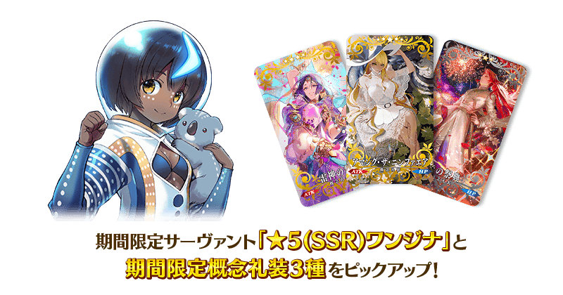 期間限定イベント「インドラの大試練 ~巡るブロークン・スカイ~」の開幕を記念して、期間限定サーヴァント「★5(SSR)ワンジナ」と期間限定概念礼装3種をピックアップ!