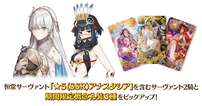 期間限定イベント「インドラの大試練 ~巡るブロークン・スカイ~」の開幕を記念して、恒常サーヴァント「★5(SSR)アナスタシア」を含むサーヴァント2騎と期間限定概念礼装3種をピックアップ!
