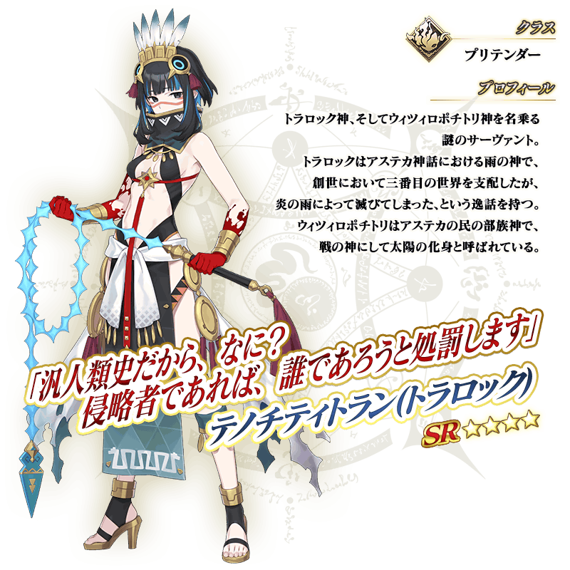 ※「★4(SR)テノチティトラン(プリテンダー)(トラロック)」の宝具は、メインクエストの進行度によって宝具の名称が変化いたします。