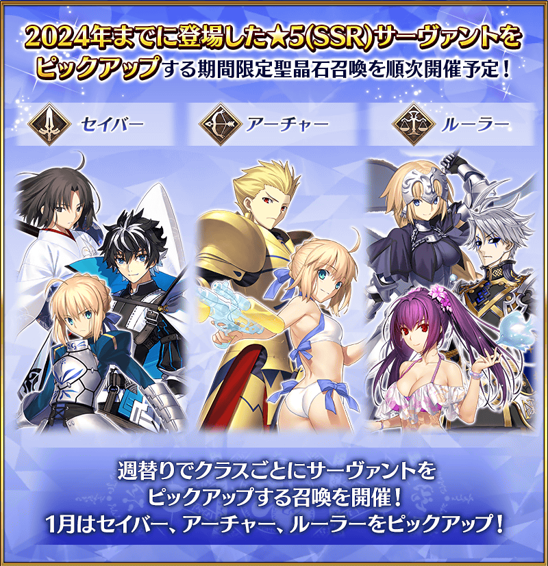 ※「2024年までに登場した★5(SSR)サーヴァント」をピックアップする召喚は、「【週替り】ピックアップ召喚」とは別の期間限定聖晶石召喚も併せて全騎をピックアップする予定です。