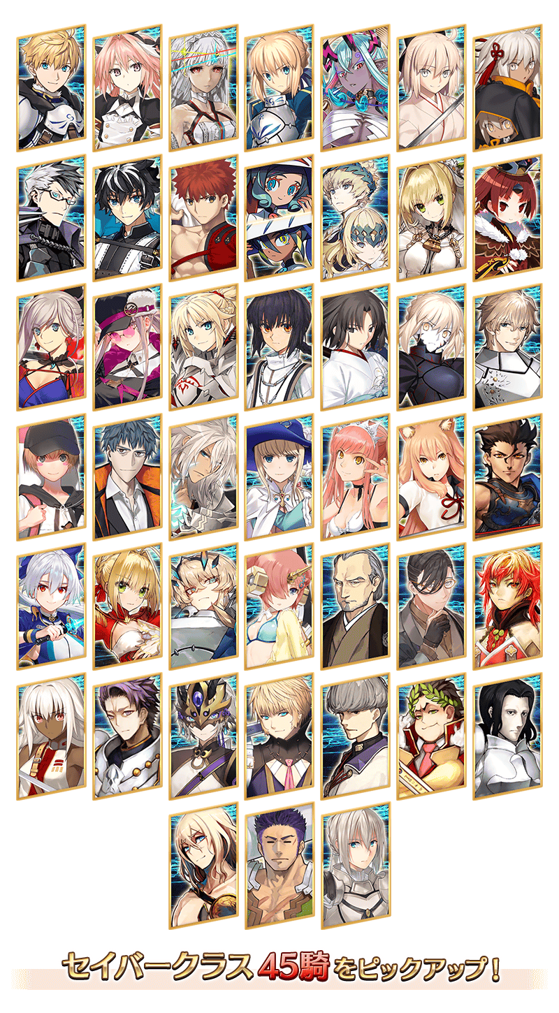 レアリティ サーヴァント名 ★★★★★ 期間限定サーヴァント アーサー・ペンドラゴン〔プロトタイプ〕★★★★★ 期間限定サーヴァント アストルフォ(セイバー)★★★★★ 恒常サーヴァント アルテラ★★★★★ 恒常サーヴァント アルトリア・ペンドラゴン(セイバー)★★★★★ 期間限定サーヴァント 伊吹童子(セイバー)★★★★★ 期間限定サーヴァント 沖田総司(セイバー)★★★★★ 期間限定サーヴァント 沖田総司〔オルタ〕(セイバー)★★★★★ 期間限定サーヴァント シグルド★★★★★ 期間限定サーヴァント シャルルマーニュ★★★★★ 期間限定サーヴァント 千子村正★★★★★ 期間限定サーヴァント 徴姉妹★★★★★ 恒常サーヴァント ディオスクロイ★★★★★ 期間限定サーヴァント ネロ・クラウディウス〔ブライド〕★★★★★ 期間限定サーヴァント 紅閻魔★★★★★ 期間限定サーヴァント 宮本武蔵(セイバー)★★★★★ 期間限定サーヴァント メドゥーサ(セイバー)★★★★★ 恒常サーヴァント モードレッド(セイバー)★★★★★ 期間限定サーヴァント ヤマトタケル★★★★★ 期間限定サーヴァント 両儀式(セイバー)★★★★ ストーリー召喚サーヴァント アルトリア・ペンドラゴン〔オルタ〕(セイバー)★★★★ ストーリー召喚サーヴァント ガウェイン★★★★ 期間限定サーヴァント ガレス(セイバー)★★★★ 期間限定サーヴァント 斎藤一★★★★ 恒常サーヴァント ジークフリート★★★★ 恒常サーヴァント シュヴァリエ・デオン★★★★ 期間限定サーヴァント 女王メイヴ(セイバー)★★★★ 恒常サーヴァント 鈴鹿御前★★★★ 恒常サーヴァント ディルムッド・オディナ(セイバー)★★★★ 期間限定サーヴァント 巴御前(セイバー)★★★★ ストーリー召喚サーヴァント ネロ・クラウディウス(セイバー)★★★★ ストーリー召喚サーヴァント バーゲスト(妖精騎士ガウェイン)★★★★ 期間限定サーヴァント フランケンシュタイン(セイバー)★★★★ ストーリー召喚サーヴァント 柳生但馬守宗矩★★★★ 期間限定サーヴァント 山南敬助★★★★ 恒常サーヴァント ラーマ★★★★ 恒常サーヴァント ラクシュミー・バーイー★★★★ 恒常サーヴァント ランスロット(セイバー)★★★★ 恒常サーヴァント 蘭陵王★★★★ 恒常サーヴァント ローラン★★★★ 恒常サーヴァント 渡辺綱★★★ 恒常サーヴァント ガイウス・ユリウス・カエサル★★★ 恒常サーヴァント ジル・ド・レェ(セイバー)★★★ 恒常サーヴァント テセウス★★★ 恒常サーヴァント フェルグス・マック・ロイ★★★ ストーリー召喚サーヴァント べディヴィエール※「★4(SR)バーゲスト(妖精騎士ガウェイン)」は、「★4(SR)妖精騎士ガウェイン」を霊基再臨第2段階にすることで名称が「★4(SR)バーゲスト」に変化します。