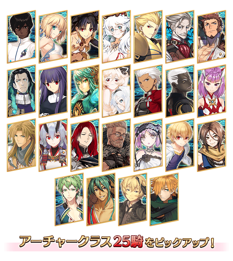 レアリティ サーヴァント名 ★★★★★ 恒常サーヴァント アルジュナ★★★★★ 期間限定サーヴァント アルトリア・ペンドラゴン(アーチャー)★★★★★ 期間限定サーヴァント イシュタル(アーチャー)★★★★★ 恒常サーヴァント オリオン★★★★★ 期間限定サーヴァント ギルガメッシュ(アーチャー)★★★★★ 期間限定サーヴァント ジェームズ・モリアーティ(アーチャー)(新宿のアーチャー)★★★★★ 恒常サーヴァント ナポレオン★★★★★ ストーリー召喚サーヴァント ニコラ・テスラ★★★★ 期間限定サーヴァント 浅上藤乃★★★★ 恒常サーヴァント アタランテ★★★★ 期間限定サーヴァント アン・ボニー&メアリー・リード(アーチャー)★★★★ 恒常サーヴァント エミヤ★★★★ ストーリー召喚サーヴァント エミヤ〔オルタ〕★★★★ 期間限定サーヴァント エレナ・ブラヴァツキー(アーチャー)★★★★ 恒常サーヴァント ケイローン★★★★ 恒常サーヴァント 巴御前(アーチャー)(アーチャー・インフェルノ)★★★★ ストーリー召喚サーヴァント トリスタン★★★ 恒常サーヴァント ウィリアム・テル★★★ 恒常サーヴァント エウリュアレ★★★ 恒常サーヴァント 子ギル★★★ 恒常サーヴァント 杉谷善住坊★★★ 恒常サーヴァント ダビデ★★★ 恒常サーヴァント 俵藤太★★★ 恒常サーヴァント ビリー・ザ・キッド★★★ 恒常サーヴァント ロビンフッド※リストに記載されていないアーチャークラスのサーヴァントは、2025年2月以降に登場を予定しております。