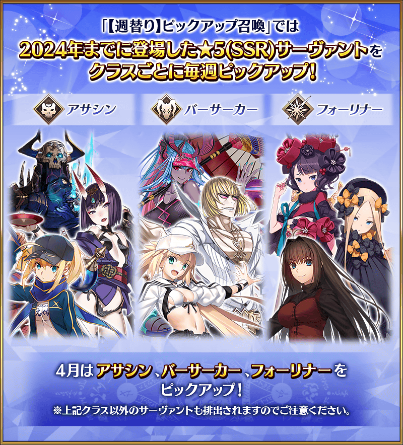 ※「2024年までに登場した★5(SSR)サーヴァント」をピックアップする召喚は、「【週替り】ピックアップ召喚」とは別の期間限定聖晶石召喚も併せて全騎をピックアップする予定です。