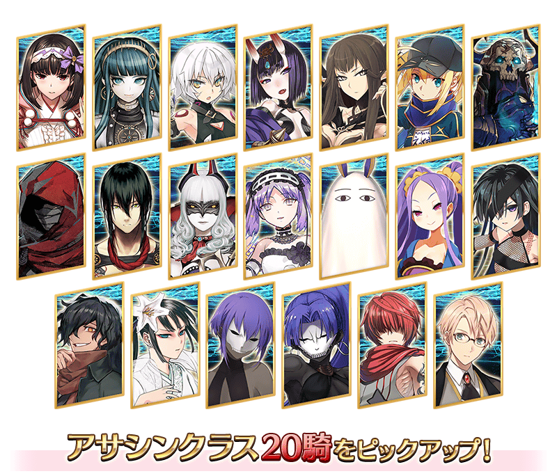 レアリティ サーヴァント名 ★★★★★ 恒常サーヴァント 刑部姫(アサシン)★★★★★ 期間限定サーヴァント クレオパトラ★★★★★ 恒常サーヴァント ジャック・ザ・リッパー★★★★★ 期間限定サーヴァント 酒呑童子(アサシン)★★★★★ 期間限定サーヴァント セミラミス★★★★★ 期間限定サーヴァント 謎のヒロインX★★★★★ 期間限定サーヴァント “山の翁”★★★★ 恒常サーヴァント エミヤ〔アサシン〕★★★★ 恒常サーヴァント 燕青(新宿のアサシン)★★★★ 恒常サーヴァント カーミラ(アサシン)★★★★ 恒常サーヴァント ステンノ★★★★ 期間限定サーヴァント ニトクリス(アサシン)★★★★ 恒常サーヴァント 武則天(アサシン)(不夜城のアサシン)★★★★ 恒常サーヴァント 望月千代女(アサシン・パライソ)★★★ 期間限定サーヴァント 岡田以蔵★★★ 恒常サーヴァント 荊軻★★★ 恒常サーヴァント 静謐のハサン★★★ 恒常サーヴァント 百貌のハサン★★★ 恒常サーヴァント 風魔小太郎★★★ 恒常サーヴァント ヘンリー・ジキル&ハイド※真名隠し対象サーヴァントについては、メインクエストの進行度によってサーヴァントおよび一部宝具の名称が変化いたします。 ※リストに記載されていないアサシンクラスのサーヴァントは、2025年5月以降に登場を予定しております。