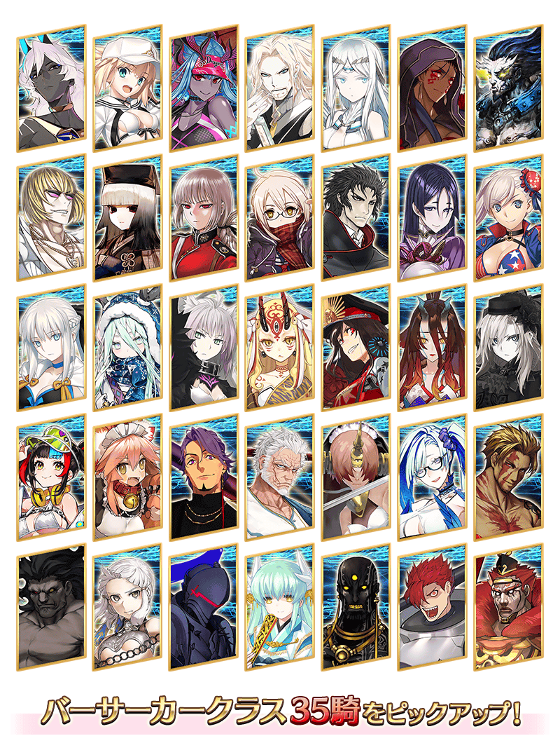 レアリティ サーヴァント名 ★★★★★ 期間限定サーヴァント アルジュナ〔オルタ〕★★★★★ 期間限定サーヴァント アルトリア・キャスター(バーサーカー)★★★★★ 期間限定サーヴァント 伊吹童子(バーサーカー)★★★★★ 恒常サーヴァント ヴラド三世★★★★★ 恒常サーヴァント ガラテア★★★★★ ストーリー召喚サーヴァント クー・フーリン〔オルタ〕★★★★★ 恒常サーヴァント 項羽★★★★★ 期間限定サーヴァント 坂田金時(バーサーカー)★★★★★ 期間限定サーヴァント 千利休★★★★★ 恒常サーヴァント ナイチンゲール★★★★★ 期間限定サーヴァント 謎のヒロインX〔オルタ〕★★★★★ 期間限定サーヴァント 土方歳三★★★★★ 期間限定サーヴァント 源頼光(バーサーカー)★★★★★ 期間限定サーヴァント 宮本武蔵(バーサーカー)★★★★★ 期間限定サーヴァント モルガン★★★★★ 恒常サーヴァント ロウヒ★★★★ 恒常サーヴァント アタランテ〔オルタ〕★★★★ 恒常サーヴァント 茨木童子(バーサーカー)★★★★ 期間限定サーヴァント 織田信長(バーサーカー)★★★★ 期間限定サーヴァント 鬼女紅葉★★★★ ストーリー召喚サーヴァント クリームヒルト★★★★ 期間限定サーヴァント 清少納言(バーサーカー)★★★★ 恒常サーヴァント タマモキャット★★★★ ストーリー召喚サーヴァント ドゥリーヨダナ★★★★ 期間限定サーヴァント 永倉新八★★★★ 恒常サーヴァント フランケンシュタイン(バーサーカー)★★★★ 期間限定サーヴァント ブリュンヒルデ(バーサーカー)★★★★ 恒常サーヴァント ベオウルフ★★★★ 恒常サーヴァント ヘラクレス★★★★ 恒常サーヴァント ペンテシレイア(エルドラドのバーサーカー)★★★★ 恒常サーヴァント ランスロット(バーサーカー)★★★ 恒常サーヴァント 清姫(バーサーカー)★★★ 恒常サーヴァント ダレイオス三世★★★ 期間限定サーヴァント 森長可★★★ 恒常サーヴァント 呂布奉先※真名隠し対象サーヴァントについては、メインクエストの進行度によってサーヴァントおよび一部宝具の名称が変化いたします。 ※「アルトリア・キャスター」はサーヴァント名となり、クラスはバーサーカーとなりますのでご注意ください。