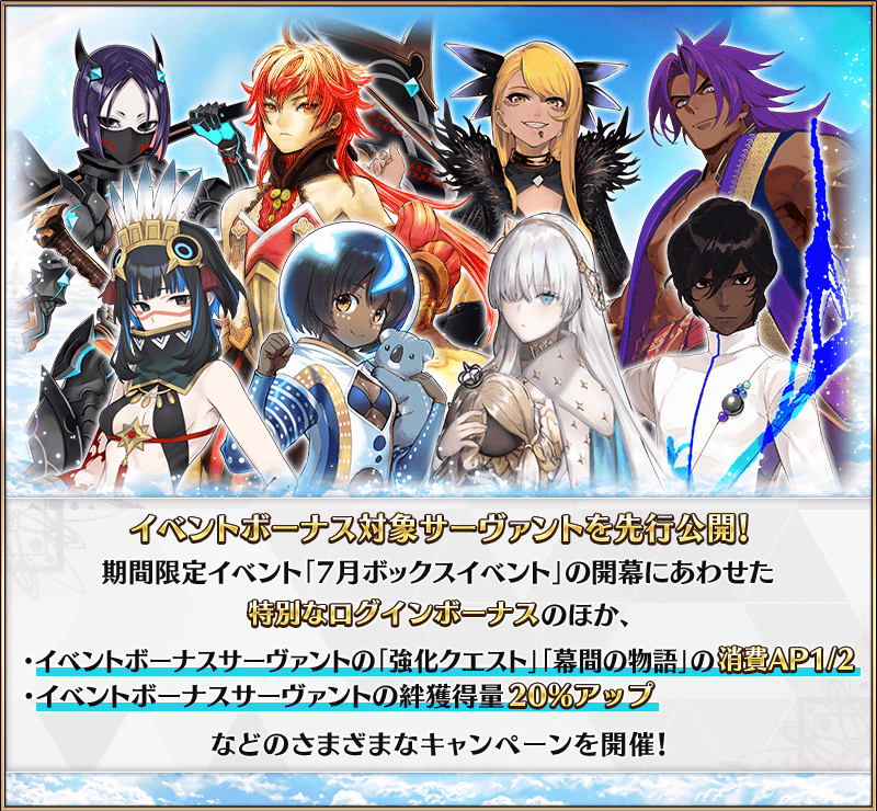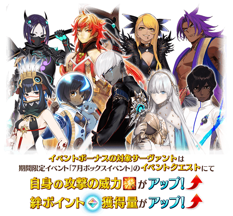 期間限定イベント「7月ボックスイベント」の期間中、一部のサーヴァントはイベントクエストにおける「自身の攻撃の威力がアップ」と「絆ポイント獲得量がアップ」のボーナスを得られます!