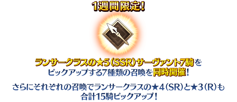ランサークラスのサーヴァントの中から期間限定サーヴァントを含む22騎のサーヴァントをピックアップする7種類の召喚を同時開催いたします!