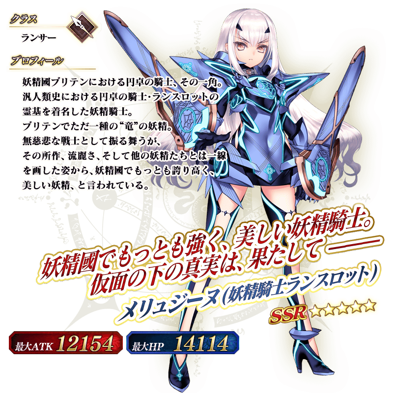 ※「★5(SSR)メリュジーヌ(ランサー)(妖精騎士ランスロット)」は、「妖精騎士ランスロット」を霊基再臨第2段階にすることで名称が「メリュジーヌ」に変化します。