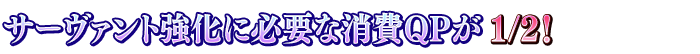 下記の期間中、サーヴァントを強化する際に必要なQPの消費量が、期間限定で1/2になります!