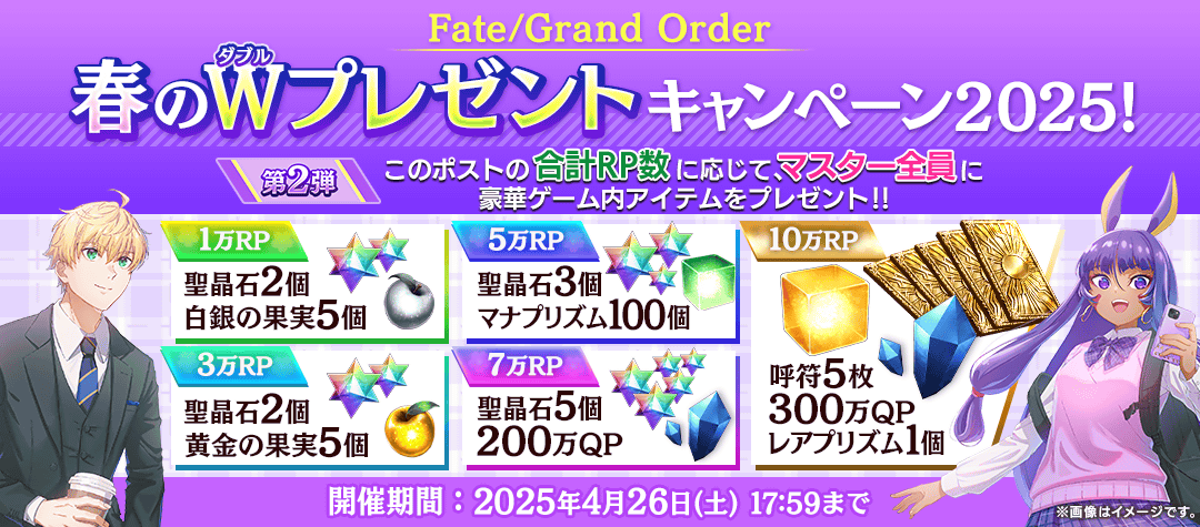 第2弾では、公式X(Twitter)の上部に固定表示されている「FGO 春のWプレゼントキャンペーン2025!第2弾」のリポスト数が下記の期間内で一定数を達成すると、ゲームをプレイしているすべてのマスターに豪華アイテムをプレゼント!