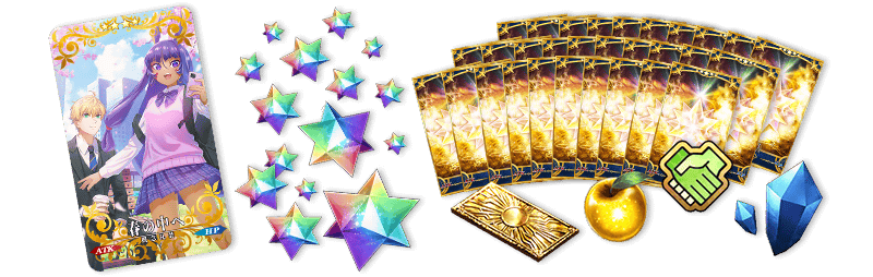 | 3日目 | 聖晶石 5個 呼符 5枚 フレンドポイント 2,000pt 10万QP 叡智の猛火ALL★4(SR) 20枚 黄金の果実 1個 |