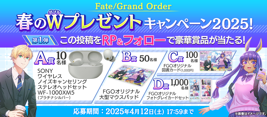 特設ページでは、公式X(Twitter)からの応募でFGOオリジナルグッズなどが当たる、「春のWプレゼントキャンペーン2025!第1弾」を開催しています!