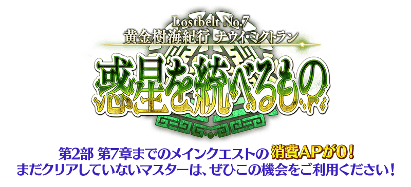 ※メインクエスト第2部 第5.5章、第6.5章および亜種特異点(ⅠからⅣまで)、メイン・インタールードは対象外となりますのでご注意ください。 ※現在、永続的にメインクエスト奏章Ⅱまでの消費APが1/2になる状態となっています。そのため、キャンペーン終了後、当該メインクエストの消費APは1/2になります。