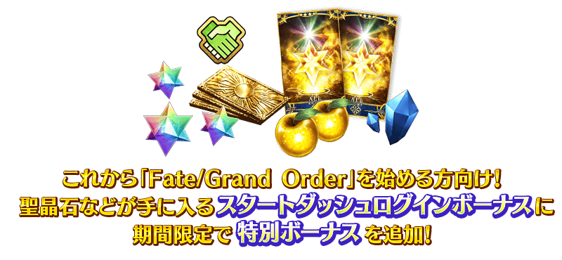 | 7日目 | 【期間限定増量】 聖晶石 60個 呼符 20枚 フレンドポイント 4,000pt 200万QP 叡智の猛火ALL★4(SR) 40枚 黄金の果実 20個 |