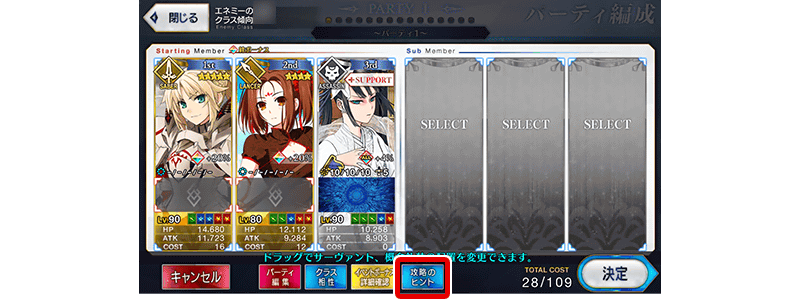 バトル開始前のパーティ編成画面にて、該当のボタンをタッチすることでヒントが表示されます。
