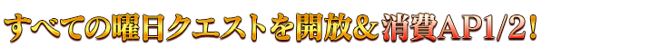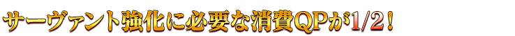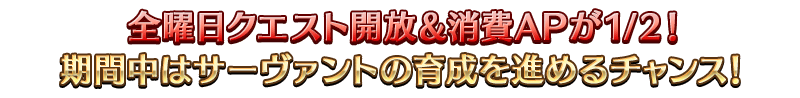 【サーヴァントを育成するチャンス】 [期間限定]コンティニューアイテム「霊脈石」が再登場! [期間限定]第2部 第7章までと奏章Ⅰのメインクエストの消費AP0! [期間限定]サーヴァント強化&概念礼装強化の大成功・極大成功率が3倍! [期間限定]サーヴァント強化に必要な消費QPが1/2! [期間限定]すべての白紙化地球上のフリークエストの消費AP1/2! [期間限定]すべての曜日クエストを開放&消費AP1/2!