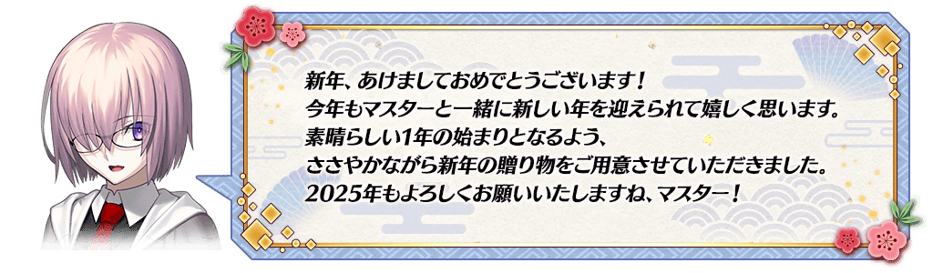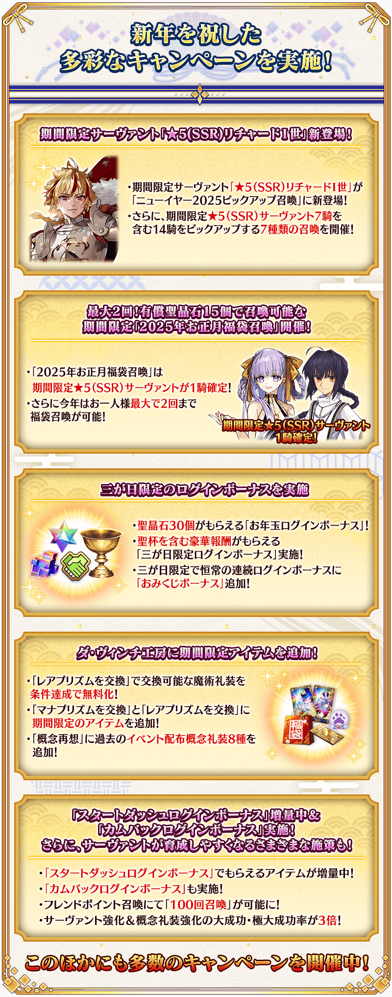 【お正月ならではのキャンペーン】 [期間限定]お年玉ログインボーナス! [期間限定]期間限定サーヴァント「★5(SSR)リチャードⅠ世」が新登場! [期間限定]リチャードⅠ世の体験クエストを期間限定で開催! [期間限定]最大2回!有償聖晶石15個で召喚可能な期間限定「福袋召喚」を開催! [期間限定]10万リポスト達成でお正月限定概念礼装&2,025万QPプレゼント! [期間限定]三が日限定ログインボーナス! [期間限定]連続ログインボーナスに「おみくじボーナス」が登場! [期間限定]魔術礼装「ウィンターカジュアル」が登場! [期間限定]お正月特別パネルミッションを開催! [期間限定]お正月限定の「メインクエスト進行度」ミッションを追加! [期間限定]デイリーミッションお正月限定版を開催! [期間限定]【2025年お正月限定素材交換券】が手に入る限定ミッションを追加! [期間限定]スタートダッシュログインボーナスの一部報酬が2倍! [期間限定]カムバックログインボーナス! [期間限定]マイルームを特別なお正月仕様に変更!
