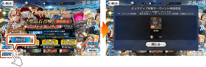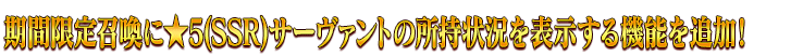 各期間限定召喚画面より、ピックアップ対象となっている★5(SSR)サーヴァントの所持状況が確認できるようになりました。