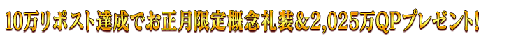 公式X(Twitter)にて、2025年1月1日(水)・2日(木)・3日(金)の各日0時に投稿される「2025年お正月キャンペーン開催!」ポストのリポスト数が、下記の期間内で合計10万リポストを達成すると、ゲームをプレイしているすべてのマスターに概念礼装「★4(SR)ファースト・カリグラフィー」と2,025万QPをプレゼント!