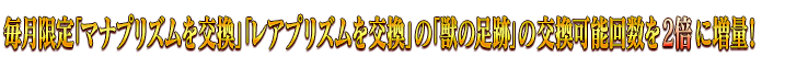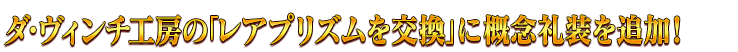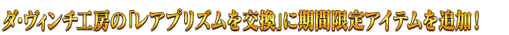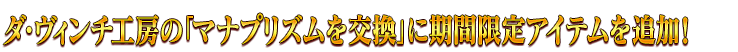 【ダ・ヴィンチ工房が充実】 [恒常]「レアプリズムを交換」で交換可能な魔術礼装を条件達成で無料化! [期間限定]「マナプリズムを交換」に期間限定アイテムを追加! [期間限定]「レアプリズムを交換」に期間限定アイテムを追加! [恒常]「概念再想」に過去のイベント配布概念礼装8種を追加! [恒常]「マナプリズムを交換」と「レアプリズムを交換」に過去のイベント配布コマンドコード8種を追加! [恒常]毎月限定「マナプリズムを交換」「レアプリズムを交換」の「獣の足跡」の交換可能回数を2倍に増量! [恒常]ダ・ヴィンチ工房の「レアプリズムを交換」に概念礼装を追加!