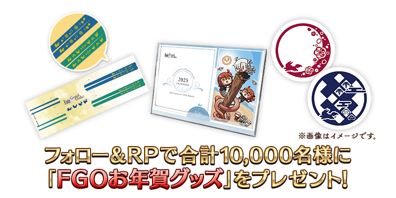 下記の期間中、「Fate/Grand Order」の公式アカウントをフォロー&対象のポストをリポストしていただくことで、日替りで内容が異なる「FGOお年賀グッズ」を抽選で合計10,000名様にプレゼント!