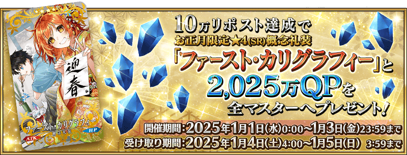 公式X(Twitter)にて、2025年1月1日(水)・2日(木)・3日(金)の各日0時に投稿される「2025年お正月キャンペーン開催!」ポストのリポスト数が、下記の期間内で合計10万リポストを達成すると、ゲームをプレイしているすべてのマスターに概念礼装「★4(SR)ファースト・カリグラフィー」と2,025万QPをプレゼント!