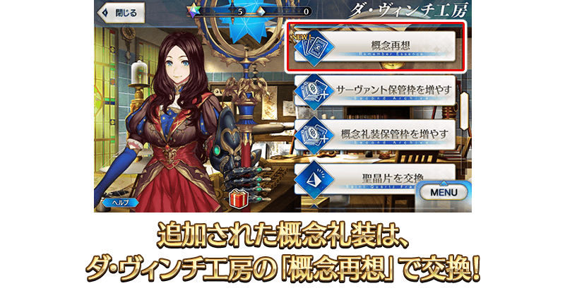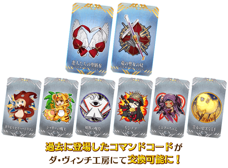 【ダ・ヴィンチ工房が充実】 [恒常]「レアプリズムを交換」で交換可能な魔術礼装を条件達成で無料化! [期間限定]「マナプリズムを交換」に期間限定アイテムを追加! [期間限定]「レアプリズムを交換」に期間限定アイテムを追加! [恒常]「概念再想」に過去のイベント配布概念礼装8種を追加! [恒常]「マナプリズムを交換」と「レアプリズムを交換」に過去のイベント配布コマンドコード8種を追加! [恒常]毎月限定「マナプリズムを交換」「レアプリズムを交換」の「獣の足跡」の交換可能回数を2倍に増量! [恒常]ダ・ヴィンチ工房の「レアプリズムを交換」に概念礼装を追加!