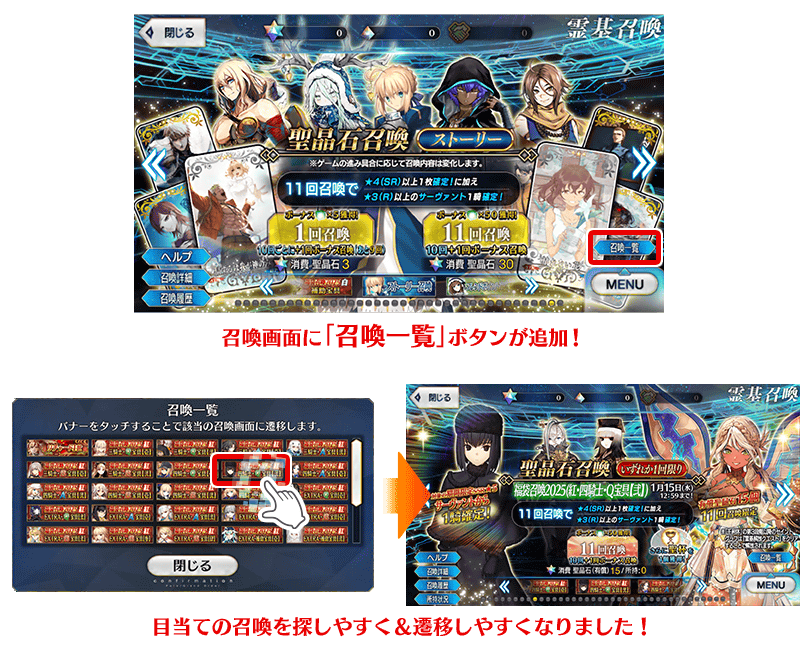 召喚画面において、「召喚一覧」ボタンが新たに追加されました。