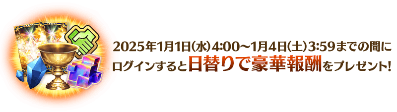 2025年1月4日(土) 4:00~1月5日(日) 3:59までの期間中、ログインをおこなった初回のタイミングに、プレゼントボックスに贈られます。