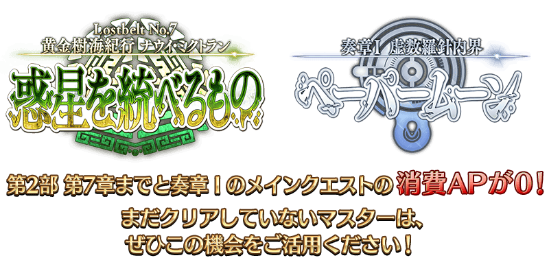 【サーヴァントを育成するチャンス】 [期間限定]コンティニューアイテム「霊脈石」が再登場! [期間限定]第2部 第7章までと奏章Ⅰのメインクエストの消費AP0! [期間限定]サーヴァント強化&概念礼装強化の大成功・極大成功率が3倍! [期間限定]サーヴァント強化に必要な消費QPが1/2! [期間限定]すべての白紙化地球上のフリークエストの消費AP1/2! [期間限定]すべての曜日クエストを開放&消費AP1/2!