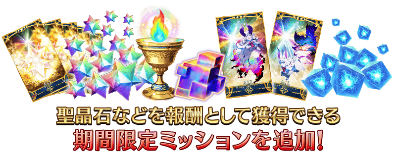 【カムバックログインボーナス合計】 ・聖晶石 30個(聖晶石召喚最大11回分) ・フレンドポイント 合計14,000pt(フレンドポイント召喚70回分) ・叡智の業火ALL★5(SSR) 18枚 ・黄金の果実 18個 ※「(聖晶石召喚最大11回分)」は、同一の聖晶石召喚をおこなった場合に限ります。