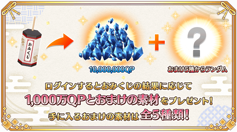 恒常の連続ログインボーナスを受け取る際に、お正月三が日限定でその日の運勢によって「1,000万QPと5種類の中からいずれかのおまけの素材が追加」される「おみくじボーナス」を実施いたします!