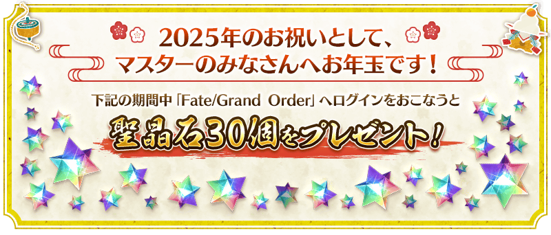 【お正月ならではのキャンペーン】 [期間限定]お年玉ログインボーナス! [期間限定]期間限定サーヴァント「★5(SSR)リチャードⅠ世」が新登場! [期間限定]リチャードⅠ世の体験クエストを期間限定で開催! [期間限定]最大2回!有償聖晶石15個で召喚可能な期間限定「福袋召喚」を開催! [期間限定]10万リポスト達成でお正月限定概念礼装&2,025万QPプレゼント! [期間限定]三が日限定ログインボーナス! [期間限定]連続ログインボーナスに「おみくじボーナス」が登場! [期間限定]魔術礼装「ウィンターカジュアル」が登場! [期間限定]お正月特別パネルミッションを開催! [期間限定]お正月限定の「メインクエスト進行度」ミッションを追加! [期間限定]デイリーミッションお正月限定版を開催! [期間限定]【2025年お正月限定素材交換券】が手に入る限定ミッションを追加! [期間限定]スタートダッシュログインボーナスの一部報酬が2倍! [期間限定]カムバックログインボーナス! [期間限定]マイルームを特別なお正月仕様に変更!